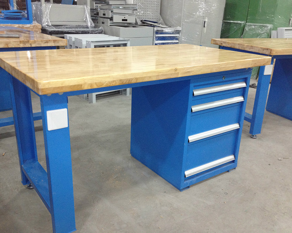 常规尺寸:1200*600*750mm、1200*800*750mm、1800*600*750mm、1800*800*750mm,其他尺寸可以定制。 产品材料: 1.桌面:防火板铺防静电垫;桌面常规厚度25mm; 30mm; 50mm;达到国家A+级标准。防静电胶皮厚2mm,采用符合国际标准的防静电胶全覆盖桌面。 2.桌架:采用钢壁厚度为1.2mm的加厚钢管(另有1.5mm的加厚钢管可选),钢管横截面尺寸为40×40mm(另有50*50的加宽钢管可选),表面处理程序 :酸洗,磷化,防静电喷涂;200度高温烘烤;质保5年,不会出现明显脱漆现象。 3.抽屉:配置两个轻型抽屉,采用优质冷轧钢板,0.8mm厚,尺寸为42*39*12cm。 4.脚垫:采用可调节范围超过5公分的车胎防滑胶承重脚垫。 适用范围:适用于电子车间、流水线车间,安装简单,使用方便。